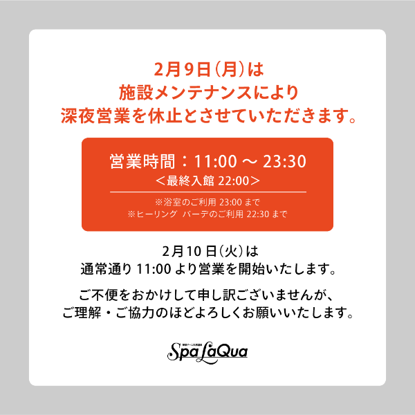Due to facility maintenance, late-night operations will be suspended on Monday, February 9th.