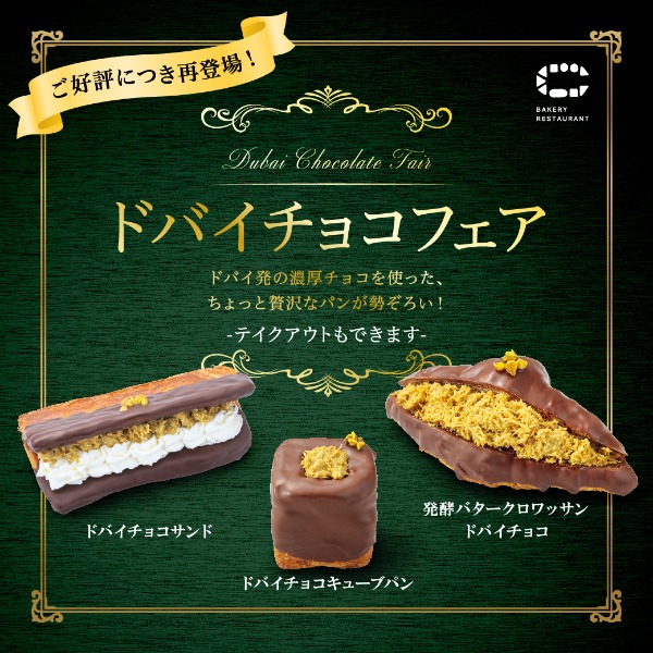 [Back by popular demand!] The Dubai Chocolate Fair is back! Enjoy Dubai Chocolate Cube Bread, Dubai Chocolate Sandwich, and Croissant with Fermented Butter and Dubai Chocolate.