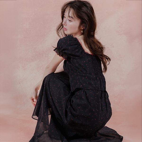 This dress is made of light chiffon with an original cherry pattern, giving it just the right amount of sweetness and elegance.