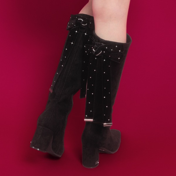 These 2-way long boots feature a gorgeous jeweled velvet ribbon.