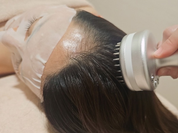 The scalp and face are massaged using an EMS device to create a firmer look.