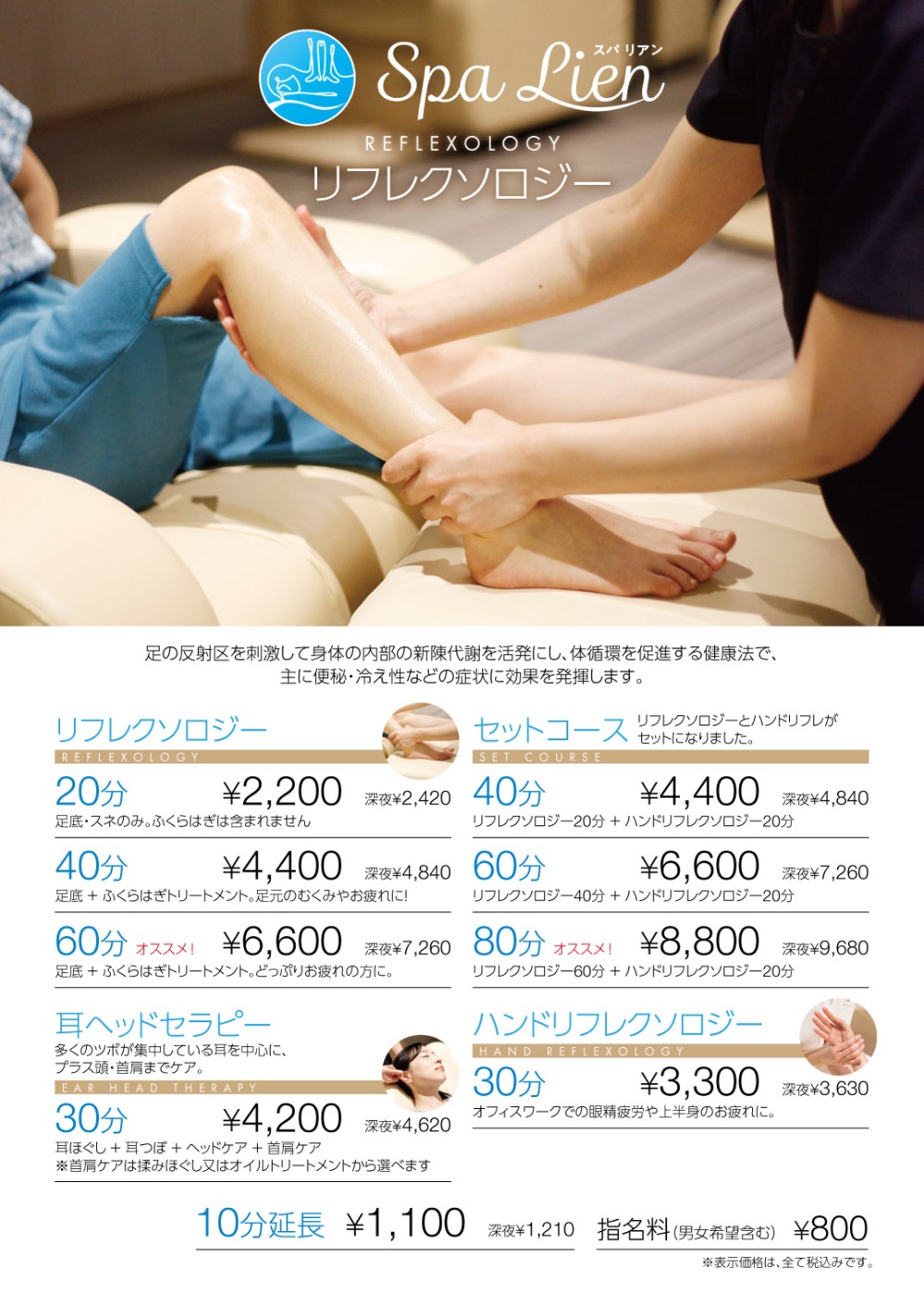 Foot care, which thoroughly stimulates the reflex zones on the soles of the feet, and ear reflexology, which focuses on stimulating the area around the ears, are also popular!