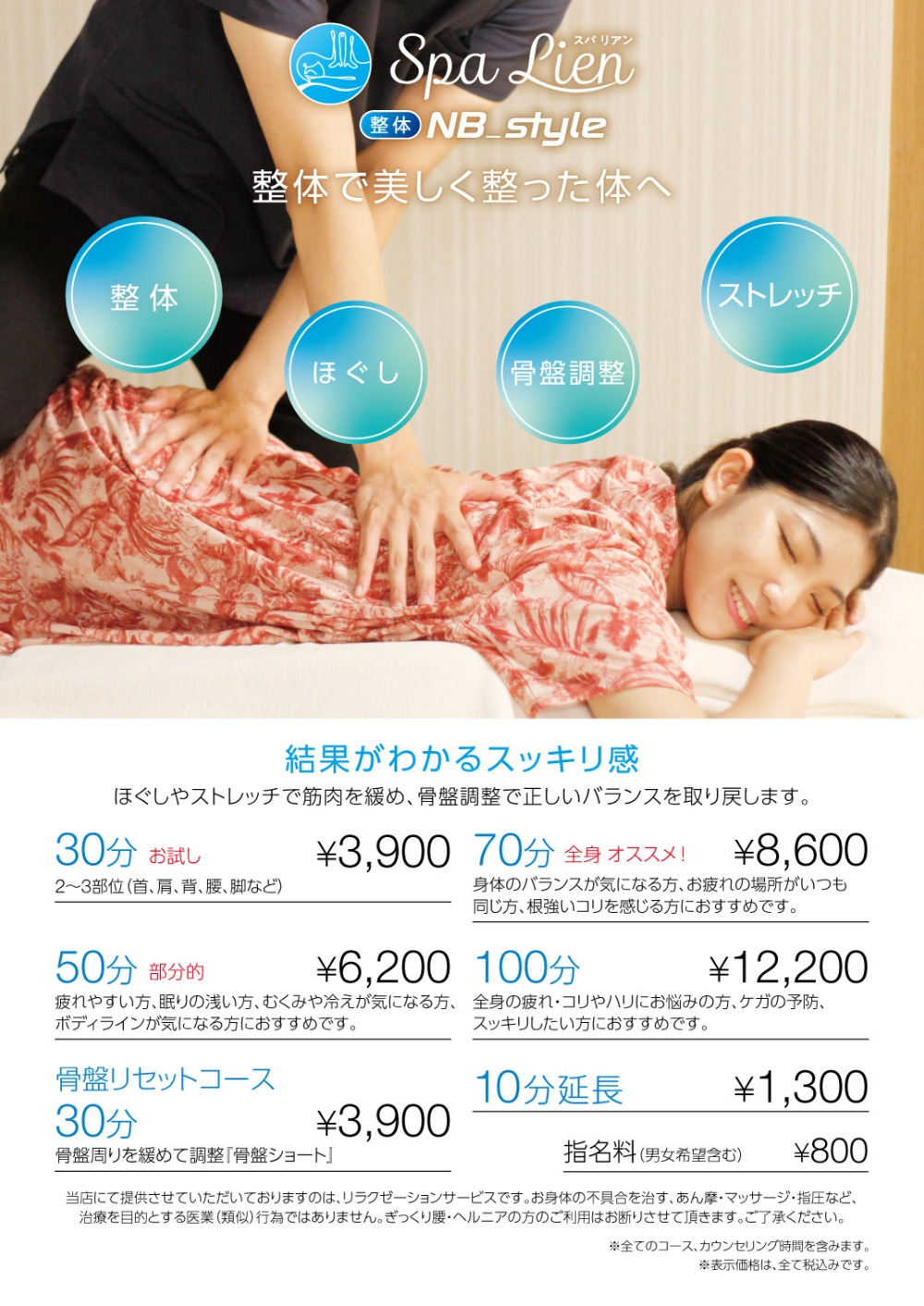 After a consultation and body check, we will perform treatment focusing on the areas where you are most concerned.