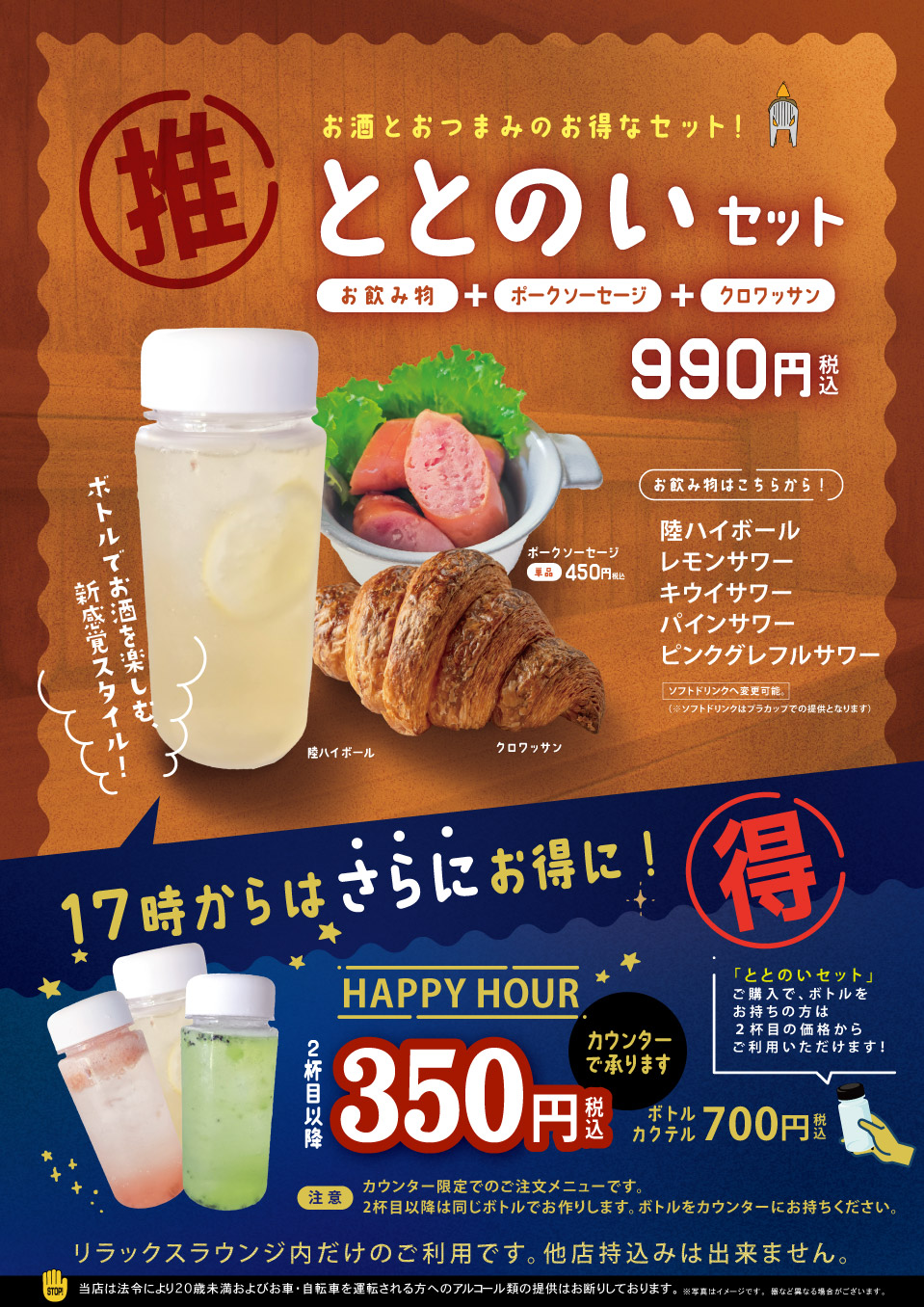 ・Totonoi Set 990 yen (bottled cocktail, pork sausage, croissant)
