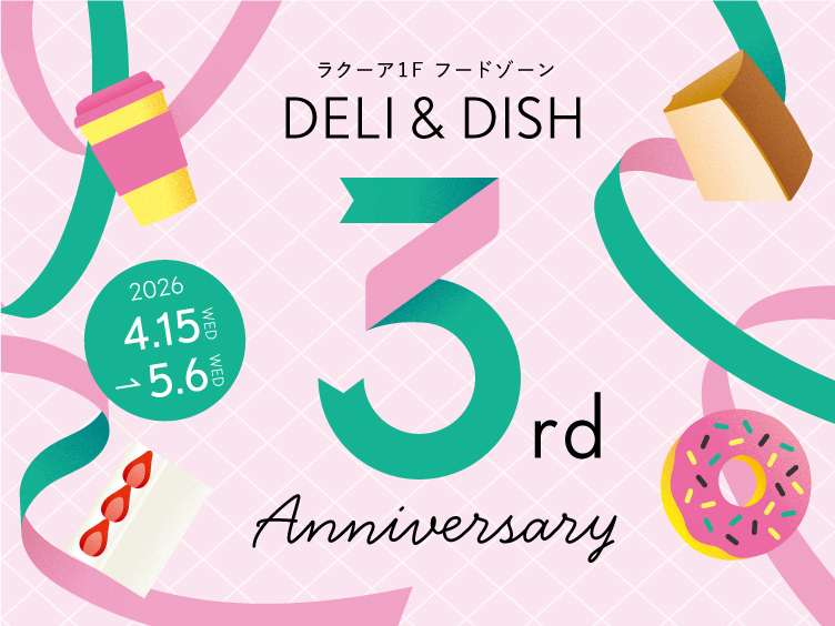ラクーア1Fフードゾーン DELI&DISHの3周年を記念して、オリジナルエコバックが貰えるスタンプラリー&TDポイントキャンペーンを開催します!